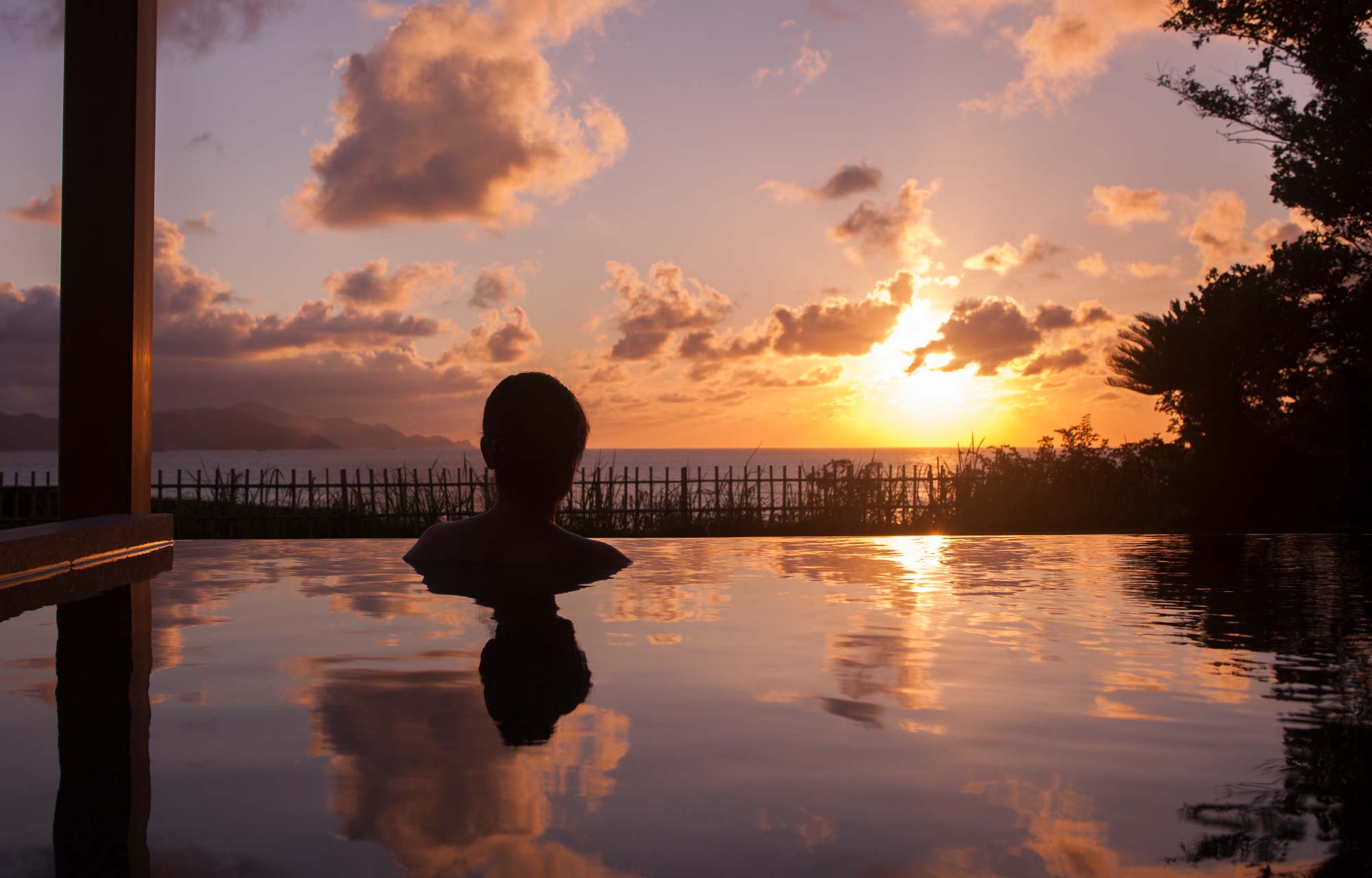 温泉風呂付き客室で湯浴み三昧のほか 眺めの良い大浴場もございます。 海や空と一体化するインフィニティ露天風呂や 石と緑が織りなす庭園露天風呂。 個性的な湯殿をお楽しみいただけます。